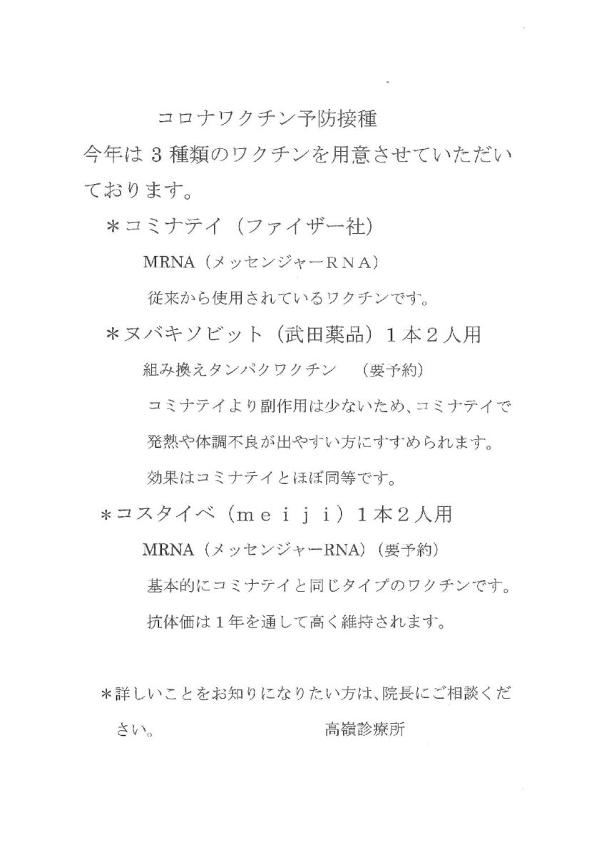 予約は必要ございません(コロナワクチンのヌバキソビットとコスタイべを希望の方は要予約)