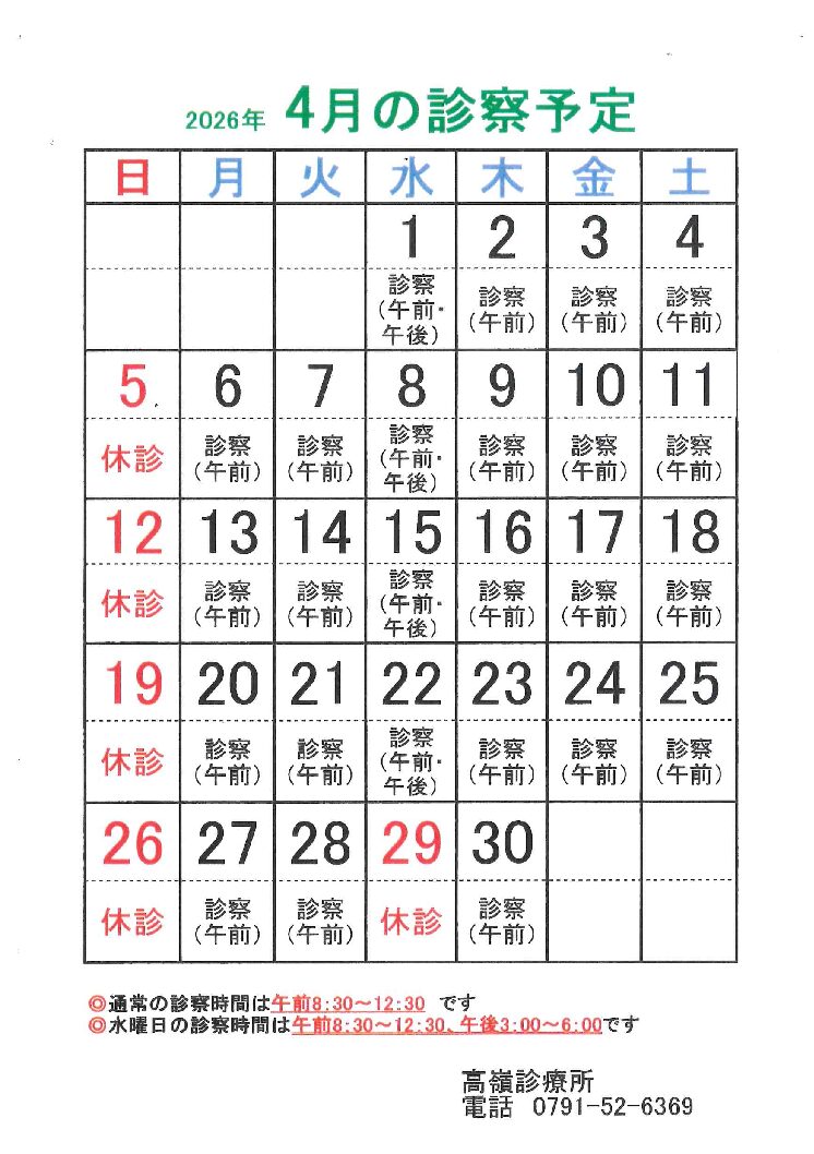 さて、4月の診察予定を掲載いたします。